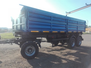 Трехосный прицеп зерновоз самосвал двухскатный 20 тонный с разгрузкой на две или три стороны, для перевозки зерновых культур и не только. Обычно идет в составе автопоезда КАМАЗ зерновоз с прицепом.